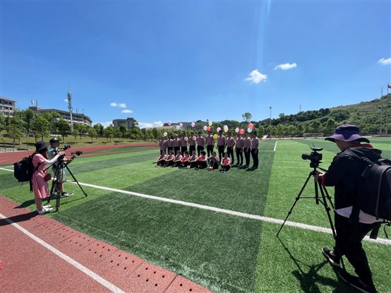 5月24日,在经开区校区的校园里,全体老师身着统一服装,不惧烈日当空照,通力合作,以饱满的精神面貌完成大合唱《没有共产党就没有新中国》录像工作。