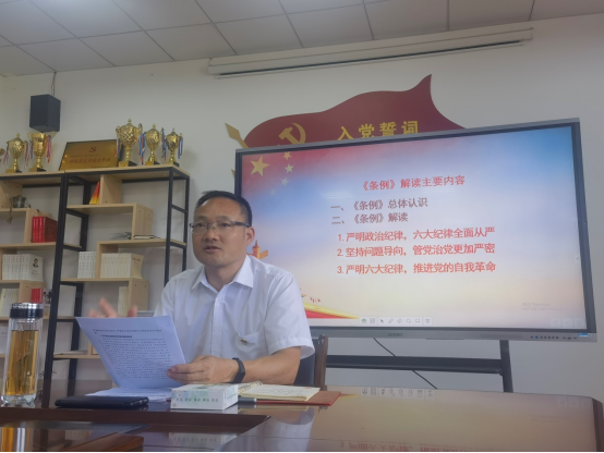樊先茂结合《条例》学习心得和工作实际,从对《条例》总体认识和学习解读两个方面出发,以鲜活的案例、详实的数据和生动的语言,围绕“严明政治纪律 六大纪律全面从严”、“坚持问题导向 管党治党更加严密”、“推进自我革命 推进党的自我革命”进行深入阐述和解读。他强调,《条例》作为规范党组织和党员行为的基础性法规,就是要始终坚持严的基调、严的措施、严的氛围,在全链条全周期全覆盖上持续发力,不断增强自我净化、自我完善、自我革新、自我提高。