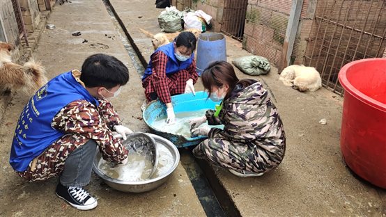 活动中,志愿者们认真打扫基地卫生,分配宠物粮,安置宠物窝等,并将此前志愿者们组织募捐得来的35件衣物、12袋狗粮、1袋羊奶粉、1袋动物尿垫以及330元善款捐赠给该基地,以实际行动表达对流浪动物的关爱。