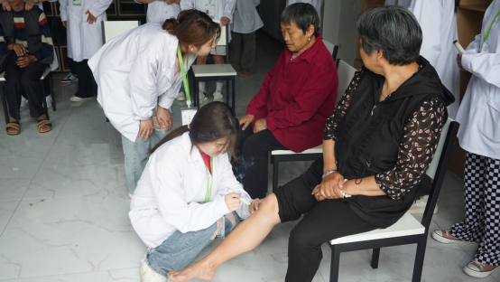 活动中,员工志愿者们利用所学的中医类专业知识,一边细心地向前来现场的社区老年人提供推拿按摩、测量血压和温灸等服务,一边向他们讲解、展示日常推拿按摩的小技巧,普及相关中医养生保健的生活小常识,以便老年人在家也能进行简单的自我推拿按摩。