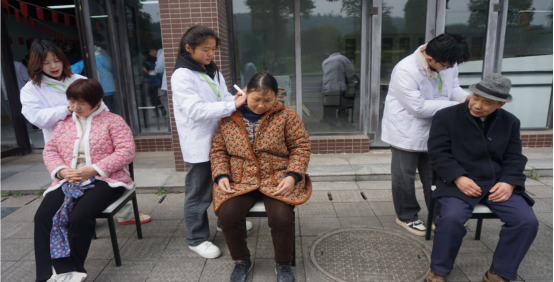 活动现场,周媛玲陈茜两位老师发挥专业特长负责为社区居民看诊提供免费检查和健康咨询服务,其余6位女教师则拿起扫把、撮箕打扫义诊点周边的卫生。员工志愿者们分为宣传组、推拿组和艾灸组协同开展志愿服务宣传组志愿者们积极向路过的居民宣传健康保健知识,引导居民前来体验特色艾灸推拿服务推拿、艾灸组志愿者们则各司其职,根据每位居民不同的健康问题提供针对性的推拿按摩和温灸,帮助他们疏通筋络,散寒止痛,放松肌肉。