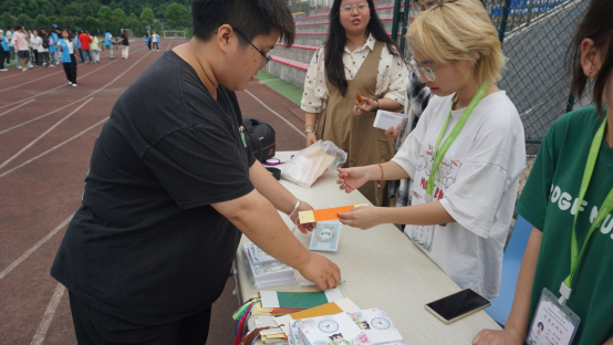 活动在当日下午17:30开始,员工会志愿者精心布置好活动点后,老师们、同学们兴致勃勃地来到现场。活动围绕端午节文化设置有击鼓传花、猜灯谜、拍照打卡等十个趣味游戏,游戏通关后,可以收集贴纸兑换奖品。整个活动现场气氛十分热烈,尚未参与的师生井然有序地排队参与游戏,已经通过游戏的师生高兴地向大家分享着经验,志愿者们则在各个游戏点位之间协调组织,记录大家欢乐的笑脸。