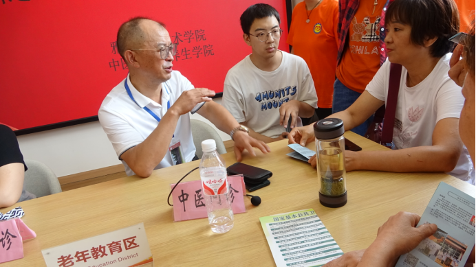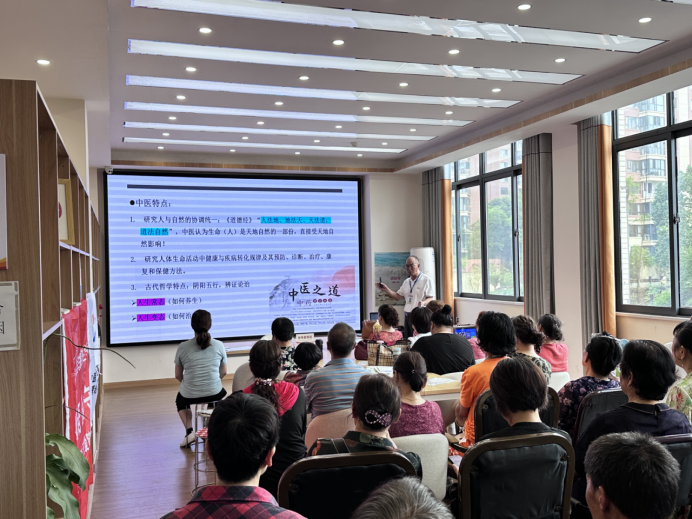 此次活动内容设有健康知识宣讲、中医问诊、健身气功八段锦教学推拿艾灸服务中药香囊制作等环节。李明荣老师围绕中医文化向社区随迁老人了一堂生动有趣的健康知识讲座,他通过冬吃萝卜夏吃姜”、“春捂秋冻”等生活谚语细致地讲解中医养生理念,引导社区随迁老人认识到在不同的季节要遵循特定的饮食与生活习惯要求保持身体健康状态同时现场演绎“一心八溪”拍击法这一养生技巧帮助随迁老人们增强气血循环,认识到通过饮食运动和生活习惯相结合可以达到养生的目的。讲座结束,李明荣和王源两位老师根据每位老人不同的健康问题提供合理建议。