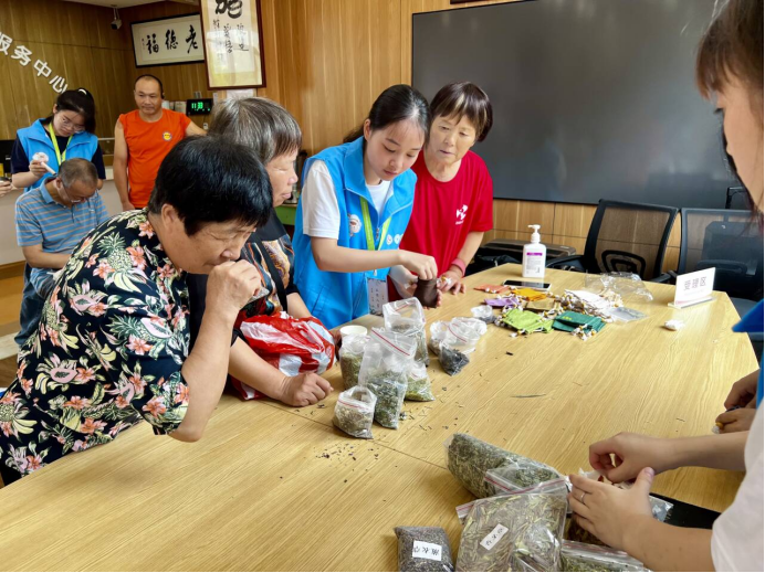 员工志愿者们则分为八段锦教学组、推拿艾灸组和中药香囊制作组,在自身服务岗位上忙得不亦乐乎。八段锦教学组组织老人们一起学习健身气功八段锦,帮助他们活动筋骨、活跃气血,促进身体健康。推拿艾灸向老人们发放健康问卷、建立基础档案,了解到他们不同的健康问题后,便采用特色推拿、艾灸服务帮助其疏松经络,缓解肌肉疼痛、酸胀等中药香囊制作组则组织老人们按照不同功效配方、个人喜好等搭配制作好一个个精美的香囊。整场活动温馨而有序,也让社区的随迁老人们感受到了无尽的温暖和感动。