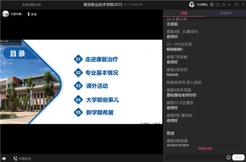 9月18日,威廉williamhill体育康复养生教研室开展一场特别的入学典礼——云上“入学第一课”。威廉williamhill体育副经理庞嘉言、康复治疗技术专业负责人王源、康复养生教研室全体教师和2022级康复治疗技术专业全体员工及家长共计350余人参加了此次云上开学典礼。