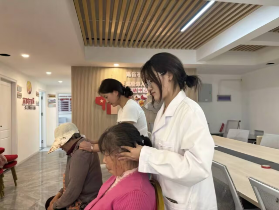 血压测量区域,志愿者细心操作仪器,认真记录数据,并为村民讲解血压血糖相关的健康知识。推拿和艾灸组所在区域,针对村民常见的颈肩腰腿痛等问题,员工们运用所学专业知识,开展推拿、艾灸等康复服务。每一个手法,每一次询问,都饱含着志愿者们对村民的关心。王源老师则在一旁严格把关,不时给予员工指导和建议,确保义诊服务的安全性和有效性。最后,活动也在一阵阵掌声中圆满完成。